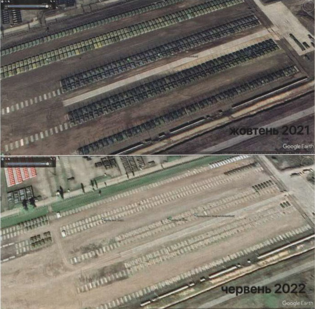 俄羅斯坦克裝甲車儲存基地有數千輛坦克,從2021年與2022年衛星照片可以看出戰爭消耗大量的坦克裝甲車。Google Earth