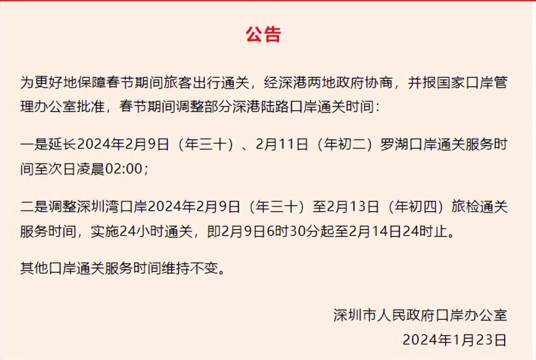 同日上午10點,深圳口岸發布也發布《關于春節期間調整部分深港陸路口岸通關時間的公告》: