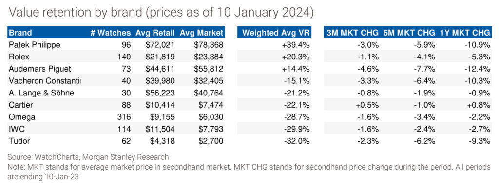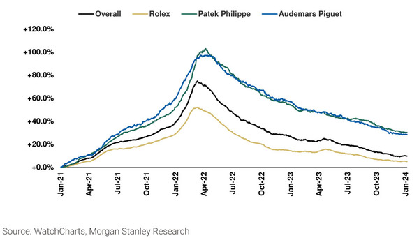 摩根士丹利對WatchCharts價格走勢的分析,發現在市場波動下,名表二手市價仍比2021年初高出10%。