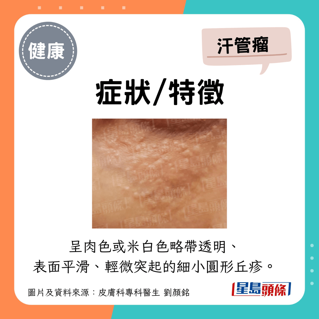 *呈肉色或米白色略帶透明、表面平滑、輕微突起的細小圓形丘疹。