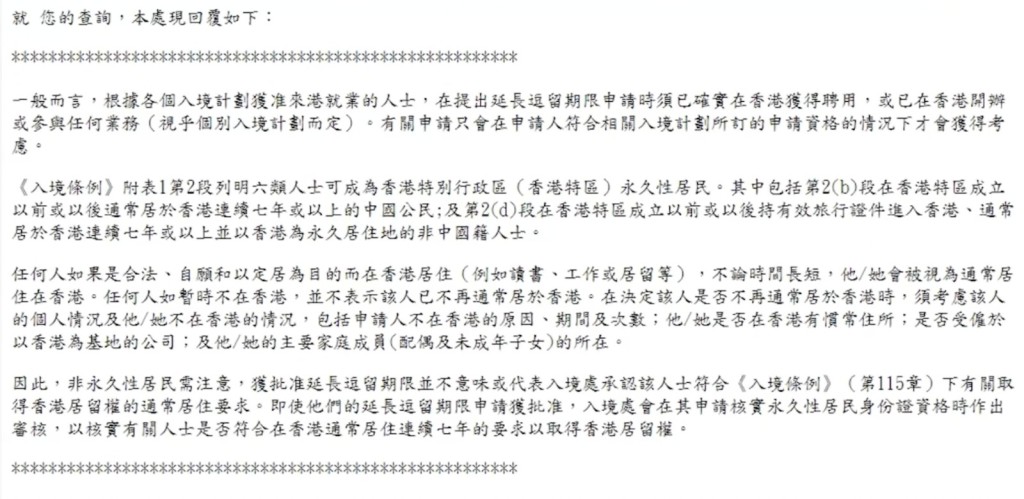 《入境條例》中表示,通常居住于香港連續七年或以上的中國公民,可成為香港特別行政區永久性居民。但“通常居住滿七年”又該如何界定?香港入境處回應稱,任何人如果是合法、自愿和以定居為目的而在香港居?。ɡ缱x書、工作或居留等),不論時間長短,他/她會被視為通常居住在香港。任何人如暫時不在香港,并不表示該人已不再通常居于香港。