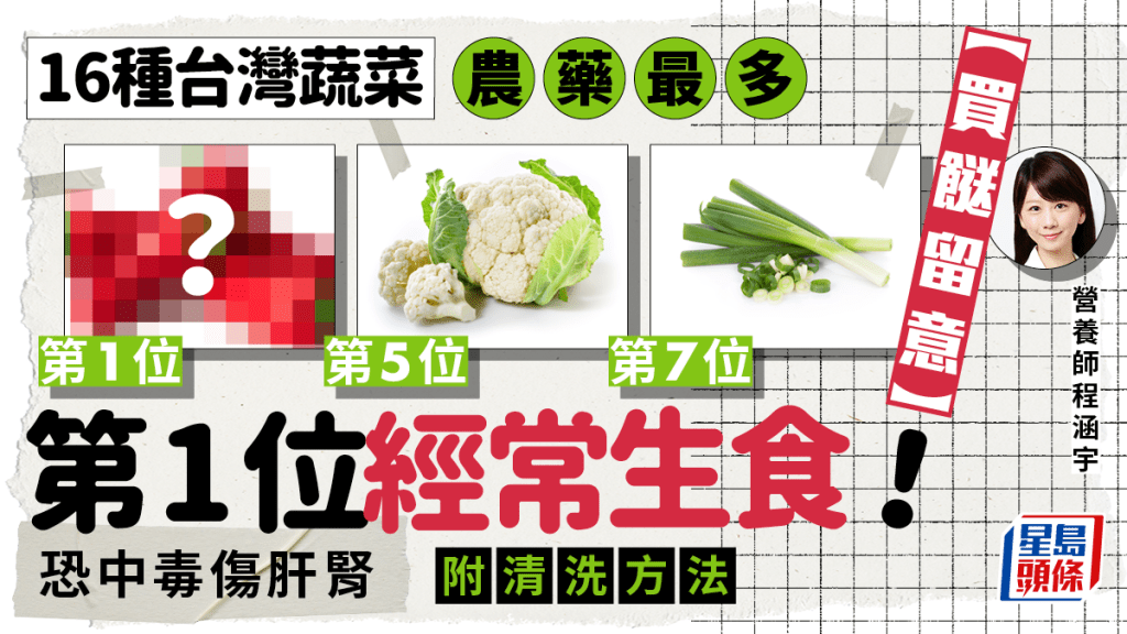 買蔬菜要留意! 臺灣“農業部”近日公布最新檢測報告,頭16位最多殘留農藥的蔬菜中,第1位是大家經常會生吃的蔬菜,但其農藥殘留比率高達20.7%! 有營養師提醒,攝取過多農藥可致中毒,肝臟受損。 她又教清洗6類常見蔬菜穿的方法,例如菜心、椰菜、西蘭花等,洗走農藥,吃得安心!