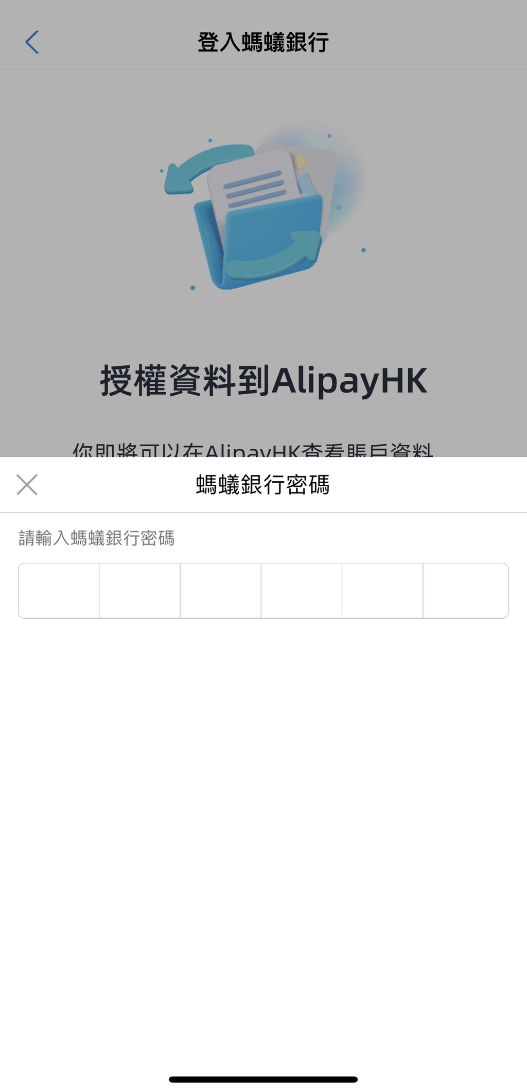▲5. 輸入螞蟻銀行密碼登入銀行,并允許授權數據到 AlipayHK;