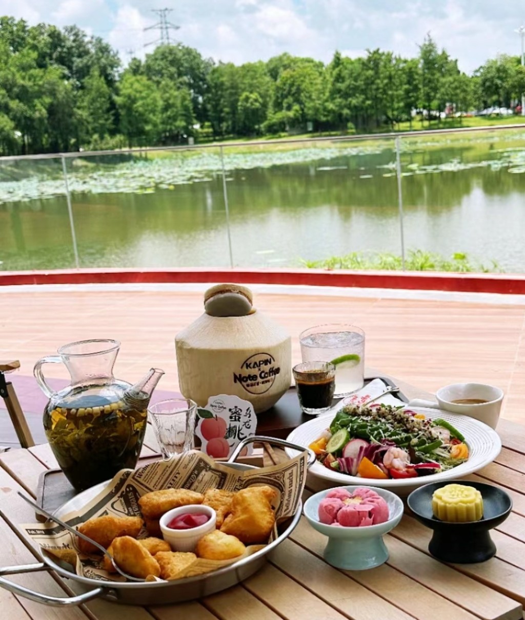 ▲東莞好去處2024|8. 荔香書吧牛油果蝦仁沙拉、原個椰青水、香香雞塊。(圖片來源:小紅書)