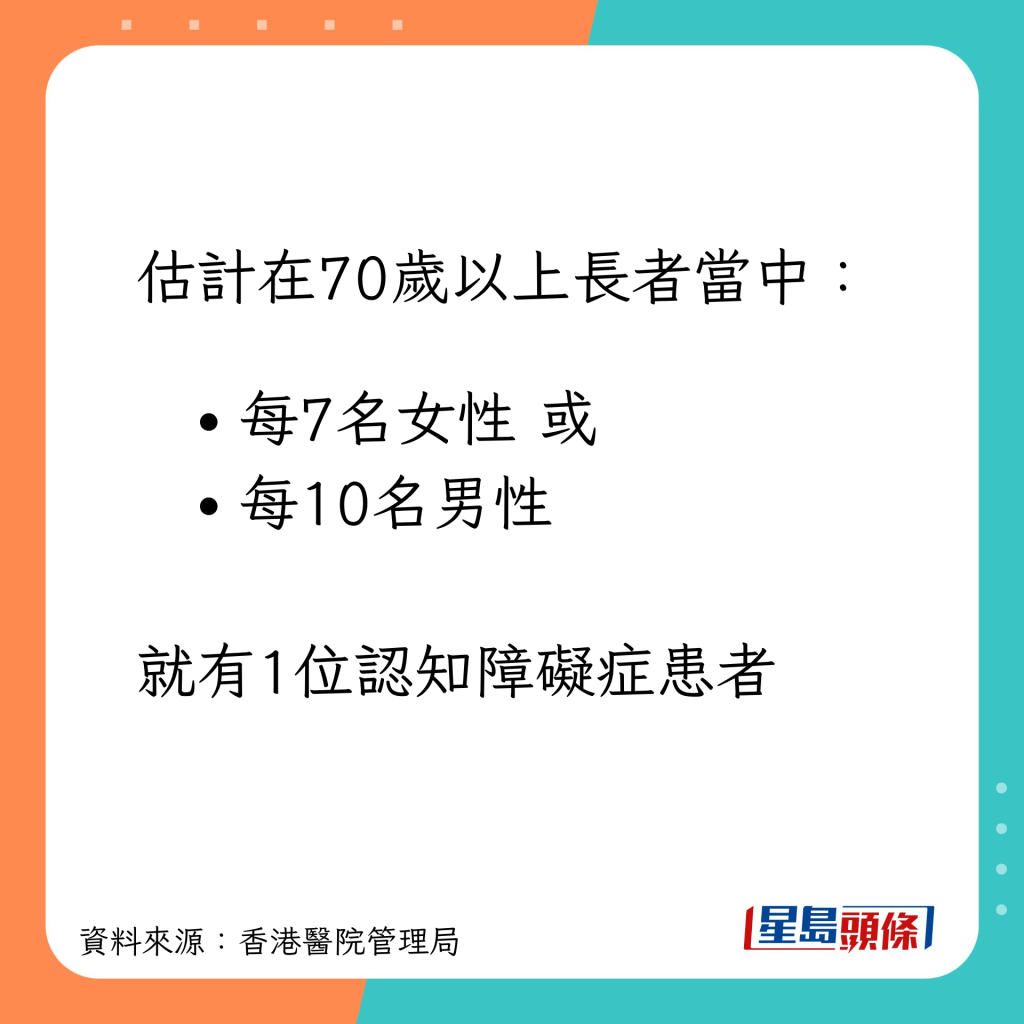 根據香港醫管局資料,患者的記憶力及其他認知功能(例如學習、理解、語言運用、方向感及判斷力等)會逐漸失去。而腦退化癥主要分為早、中及晚期。