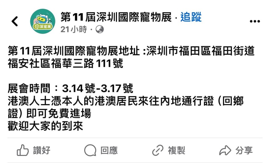 ▲港澳居民憑回鄉證可免費入場。(圖片來源:Facebook@第11屆深圳國際寵物展 )