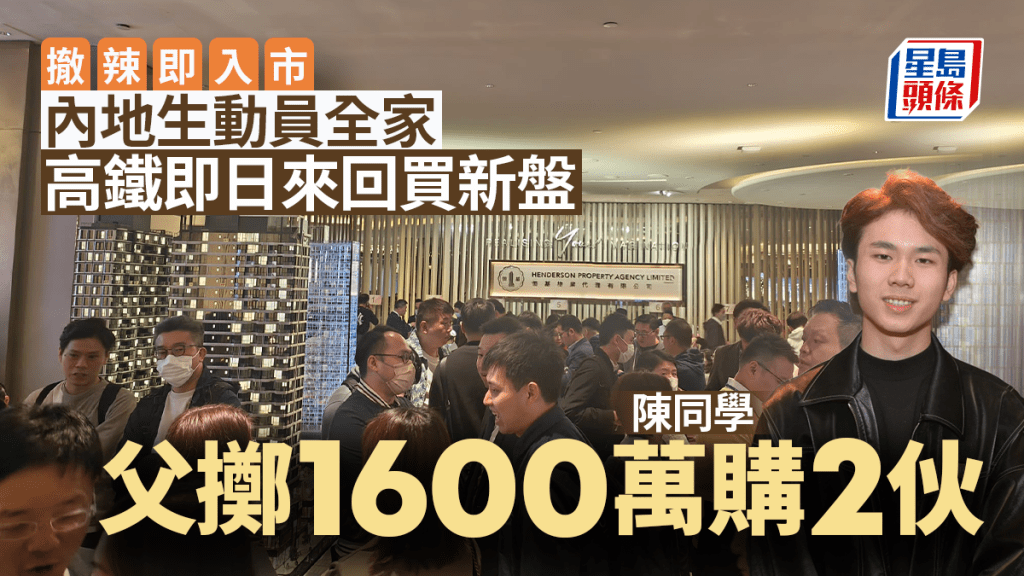 內地生陳同學透露,昨日早上9時“一家三口”特意于廣州來港買樓,惟3人只有父親抽中前抽籌,故豪擲1500萬至1600萬購入項目2伙兩房單位,買樓后隨即乘坐高鐵返回內地。坦言是因全面撤辣后才決定入市,計劃用作投資收租之用,并透露目前于廣州就讀大學,畢業后計劃于香港發展,不排除將來用作自住。