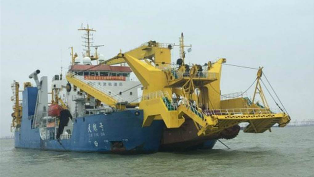 ▲前立委郭正亮表示,海委會主委管碧玲喊出驅離逾萬噸挖泥船,但這樣的船一定超過1萬噸。 圖為大陸挖泥船“天鯨號”,是禁止出口的“造島神器”。環球網