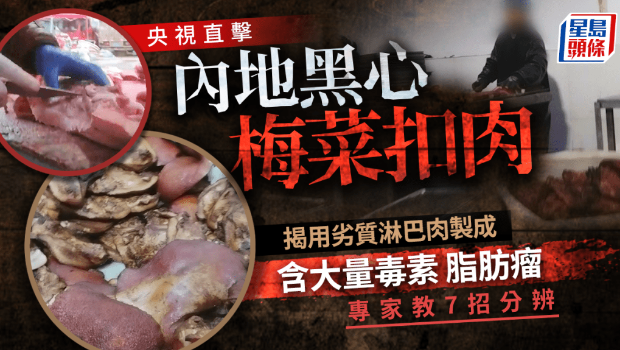 內地近年流行預制菜,是一種預先在食品工場制作的食物半成品或成品,只需加熱就可食用。 央視早前于315晚會揭發有預制菜企業以劣質槽頭肉為原料,制作黑心梅菜扣肉。 節目指,槽頭肉又被稱為淋巴肉,里面含有大量毒素、淋巴結、脂肪瘤,可導致中毒,因此不適宜食用。 有專家又教用7招分辨新鮮豬肉,避免進食質量差的黑心肉。