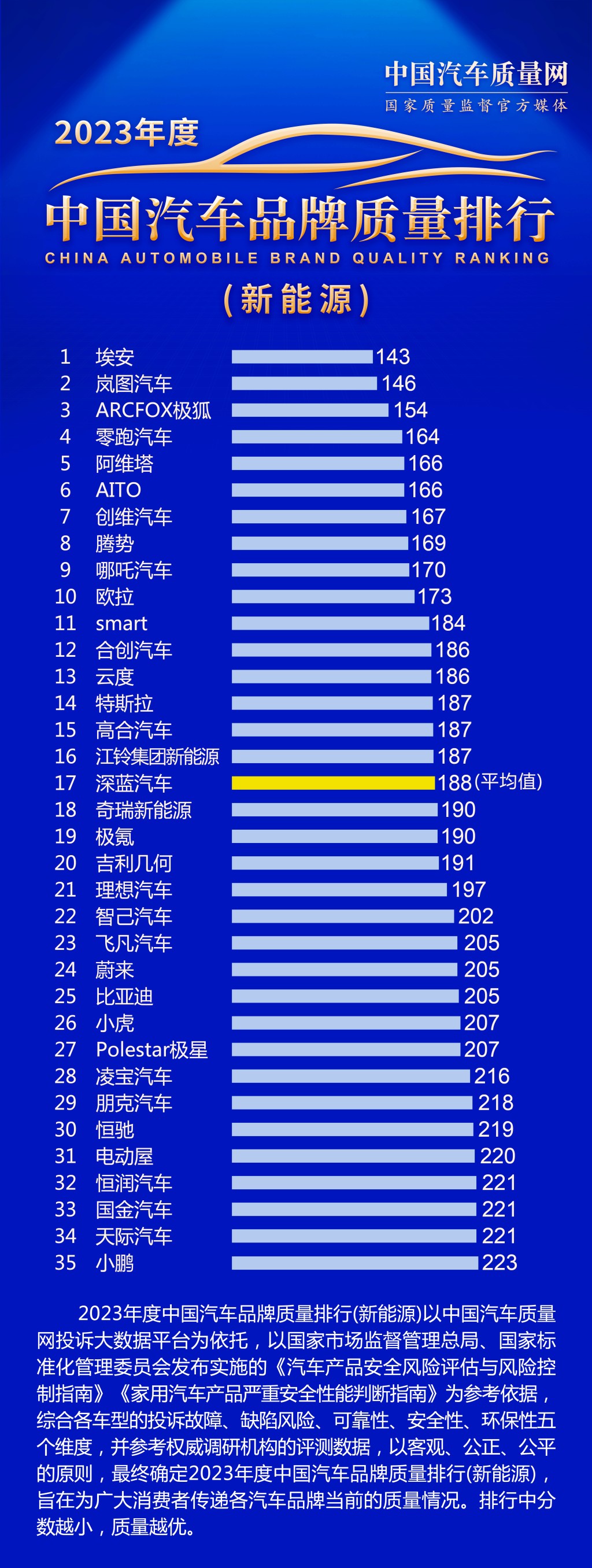 其中,新能源車品牌的排行榜在平均值或以上有17個品牌,前5位分別為埃安、嵐圖汽車、Arcfox極狐、零跑汽車及阿維塔。前3名質量評分相距不大,根據2023年中國汽車質量網統計的信息顯示,由于潛在缺陷風險低、可靠性高,因而被評定綜合質量表現良好;而香港有售的哪吒汽車、歐拉、Smart、Tesla則分佔榜的第9、第10第11及第14位。