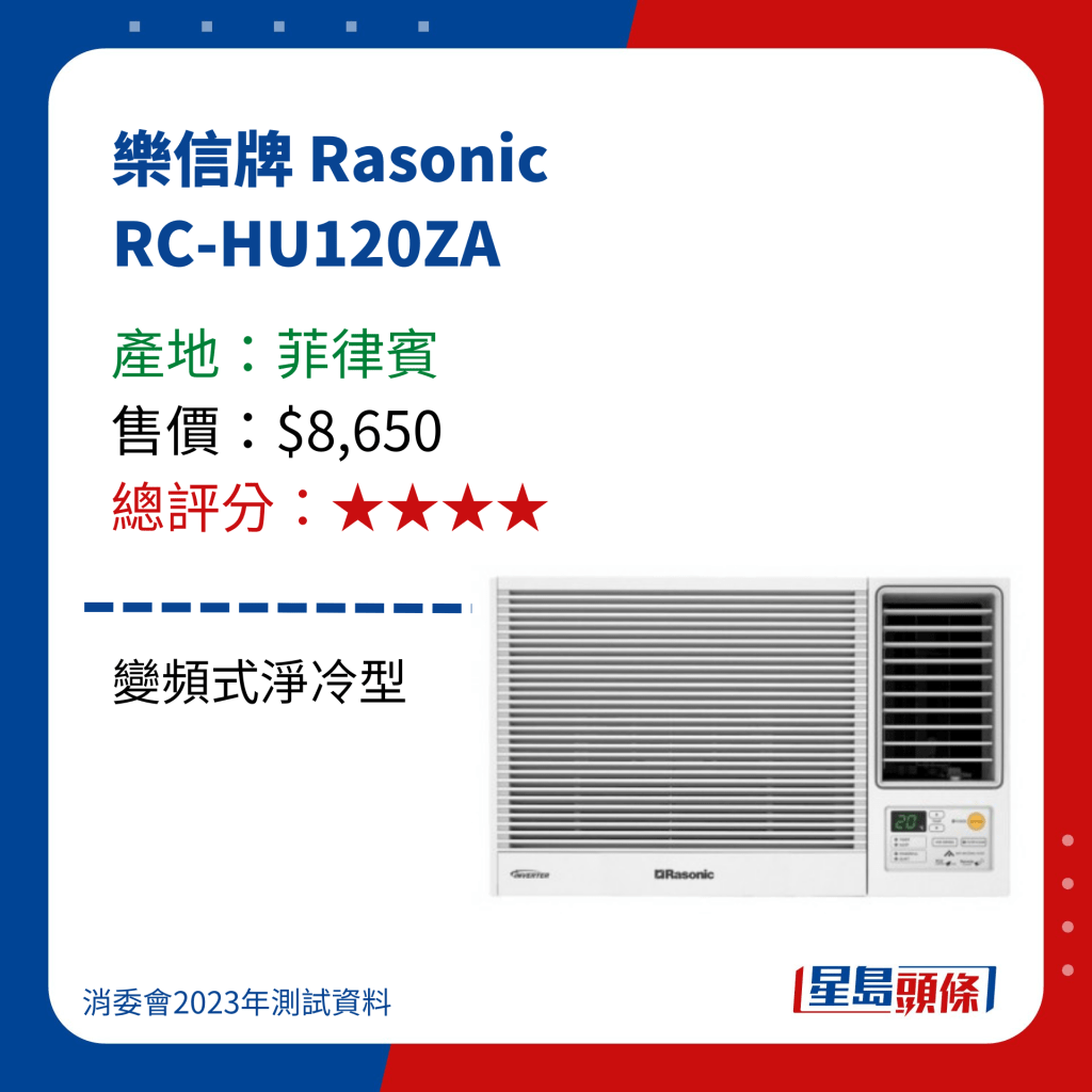 Rasonic 樂信的冷氣機在兩次消委會測試中分別獲得 4星及4.5星高評分。最新型號 Rasonic 樂信 RC-HU90A 變頻凈冷窗口機(無線遙控型)(1匹), 采用 nanoe-G 空氣凈化系統及R32 環保雪種,制冷量達 9,100 BTU/h, 能源標簽 1級??墒褂米冾l式控制,有效調節運轉功率及節省耗電量。