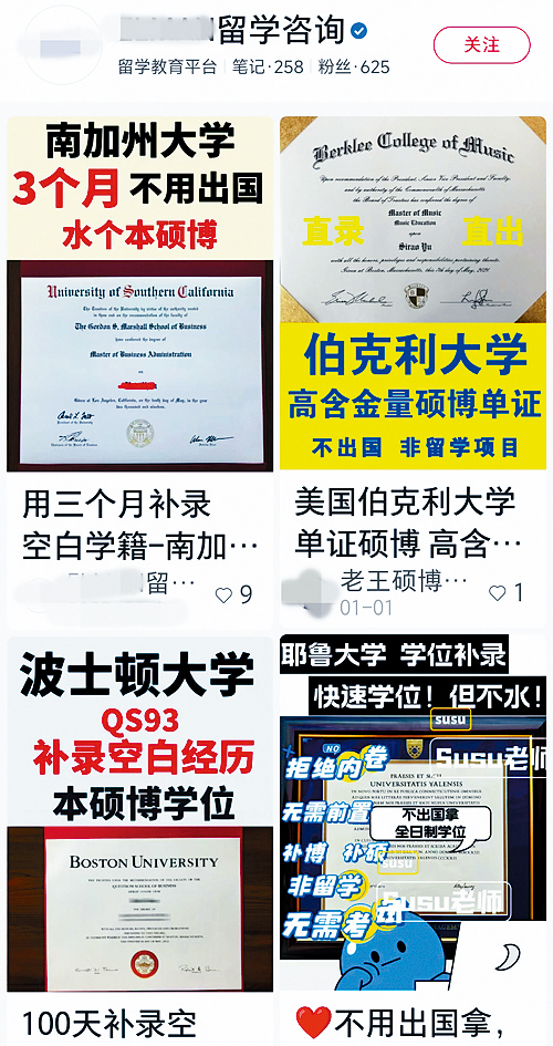 ▲“小紅書”有多個聲稱提供“學籍補錄”的貼文,稱可直接取得外國名牌大學的學位。
