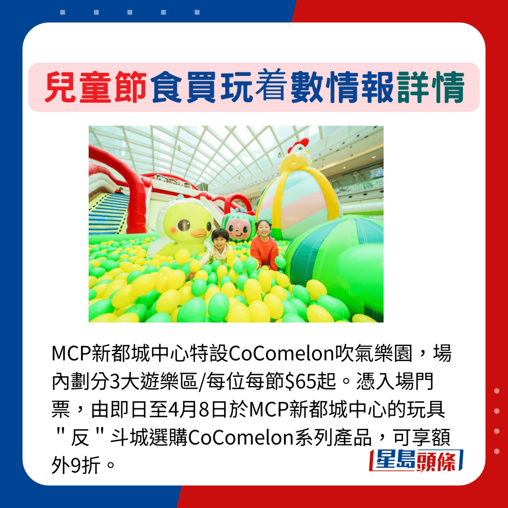 ▲MCP新都城中心特設CoComelon吹氣樂園,場內劃分3大游樂區/每位每節$65起。憑入場門票,由即日至4月8日于MCP新都城中心的玩具"反"斗城選購CoComelon系列產品,可享額外9折。