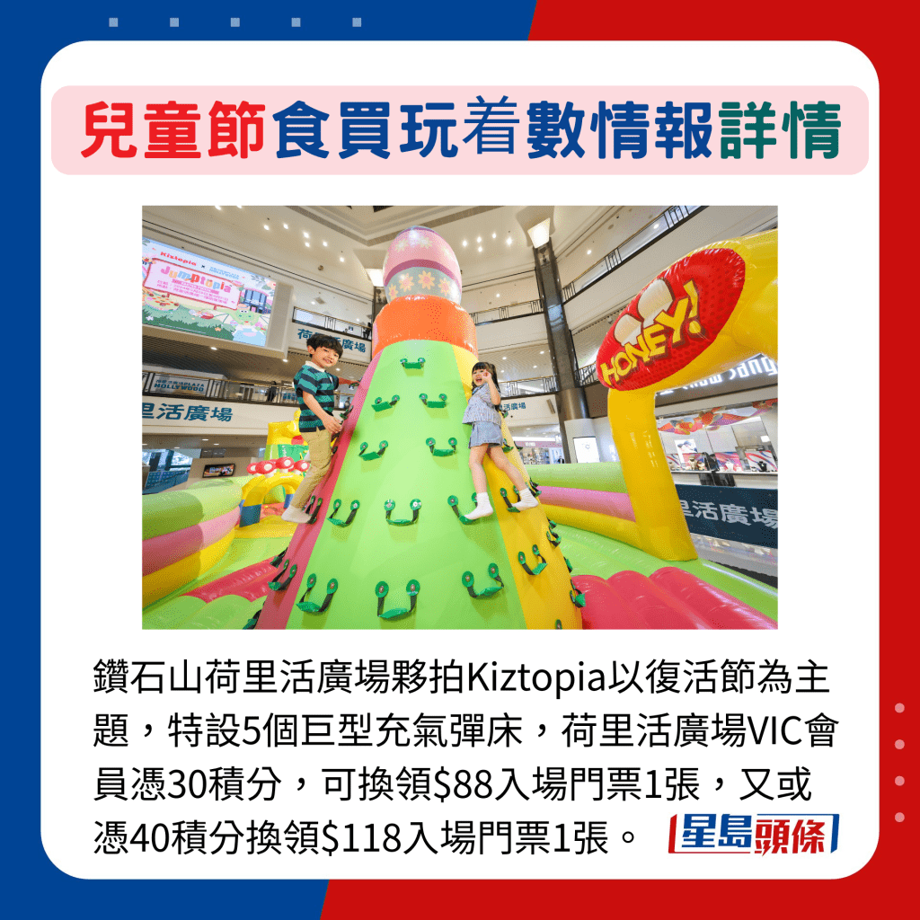 ▲鉆石山荷里活廣場伙拍Kiztopia以復活節為主題,特設5個巨型充氣彈床,荷里活廣場VIC會員憑30積分,可換領$88入場門票1張,又或憑40積分換領$118入場門票1張。
