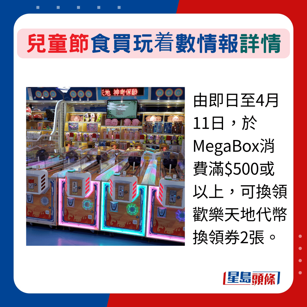 ▲由即日至4月11日,于MegaBox消費滿$500或以上,可換領歡樂天地代幣換領券2張。