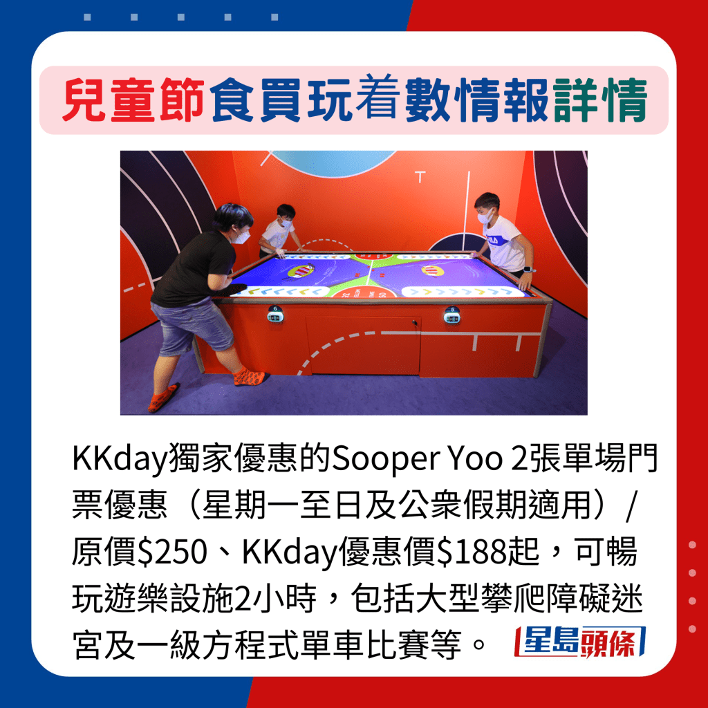 ▲KKday獨家優惠的Sooper Yoo 2張單場門票優惠(星期一至日及公眾假期適用)/原價$250、KKday優惠價$188起,可暢玩游樂設施2小時,包括大型攀爬障礙迷宮及一級方程式單車比賽等。
