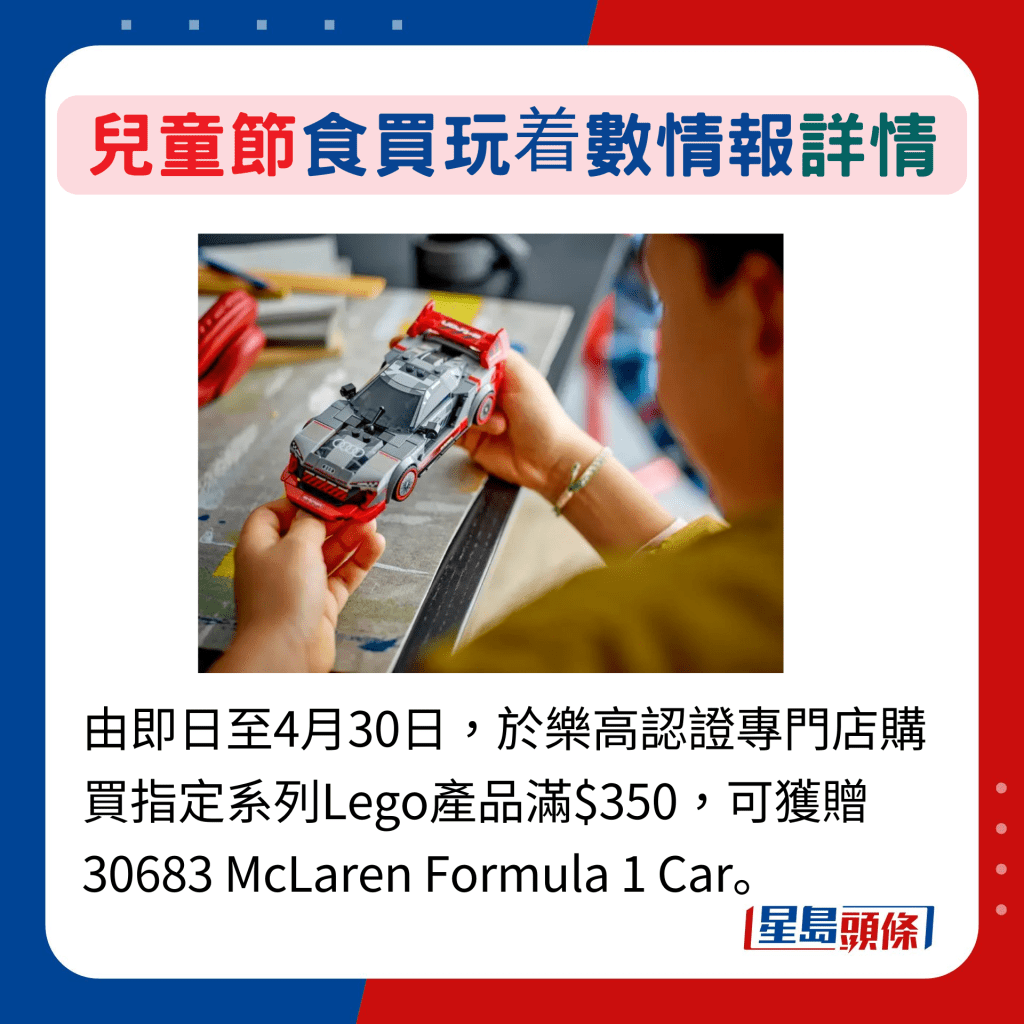 ▲由即日至4月30日,于樂高認證專門店購買指定系列Lego產品滿$350,可獲贈30683 McLaren Formula 1 Car。