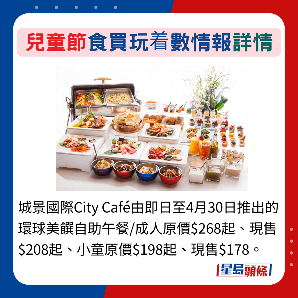 城景國際City Café由即日至4月30日推出的環球美饌自助午餐/成人原價$268起、現售$208起、小童原價$198起、現售$178。
