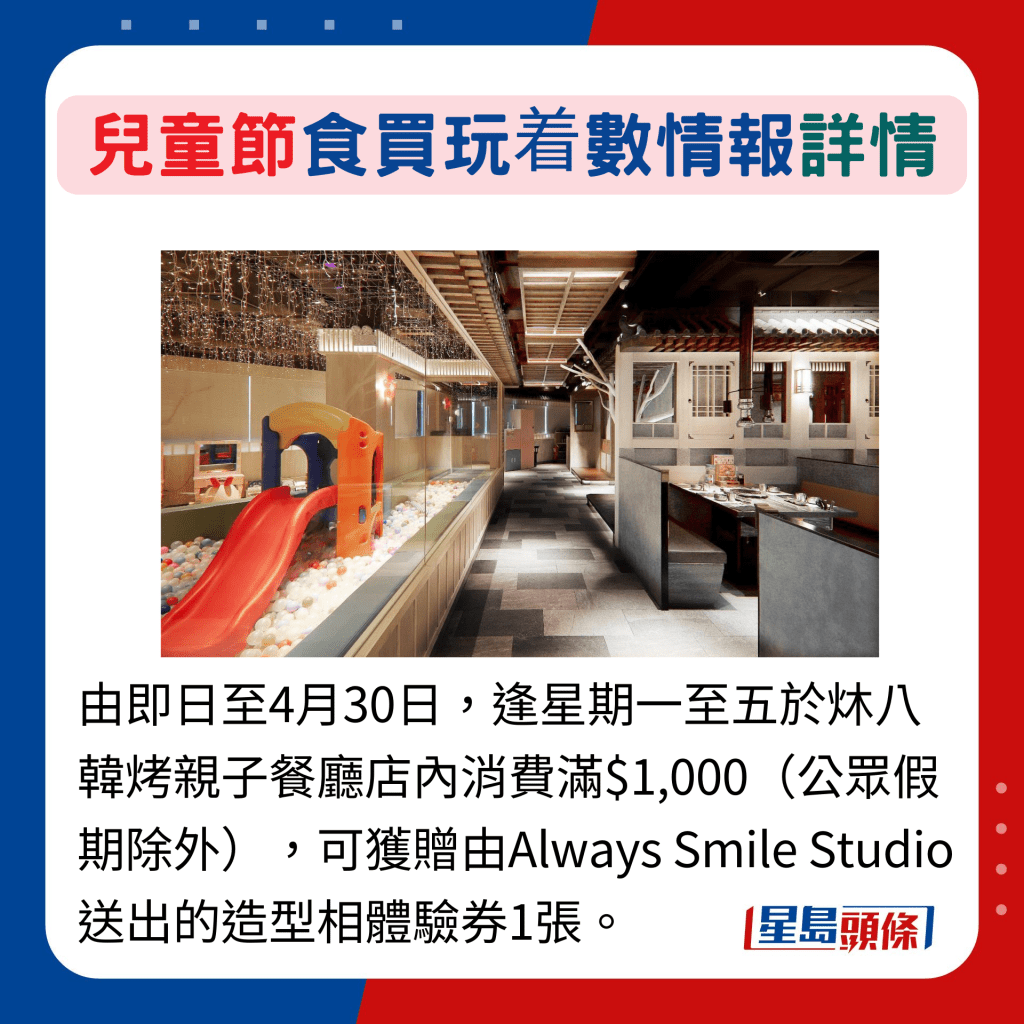 ▲由即日至4月30日,逢星期一至五于炑八韓烤親子餐廳店內消費滿$1,000(公眾假期除外),可獲贈由Always Smile Studio送出的造型相體驗券1張。
