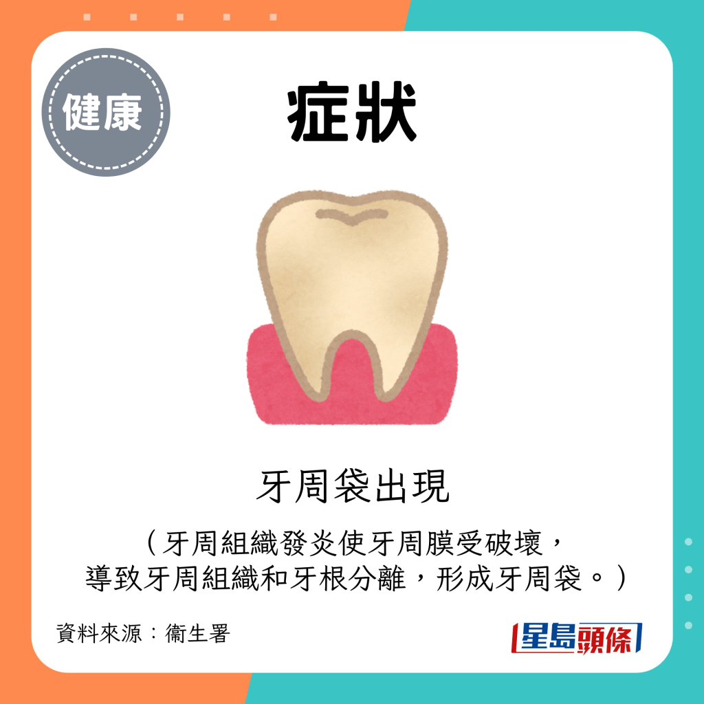 4. 牙周袋出現(牙周組織發炎使牙周膜受破壞,導致牙周組織和牙根分離,形成牙周袋。 )