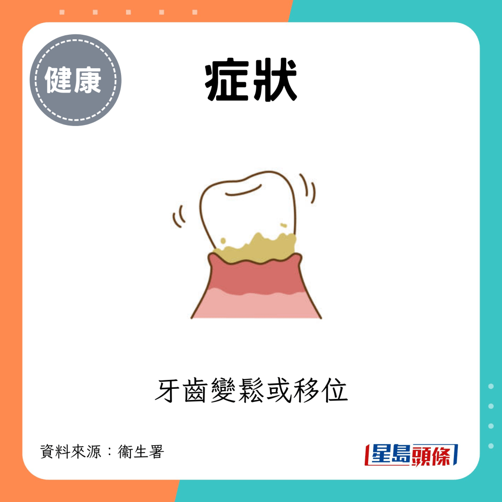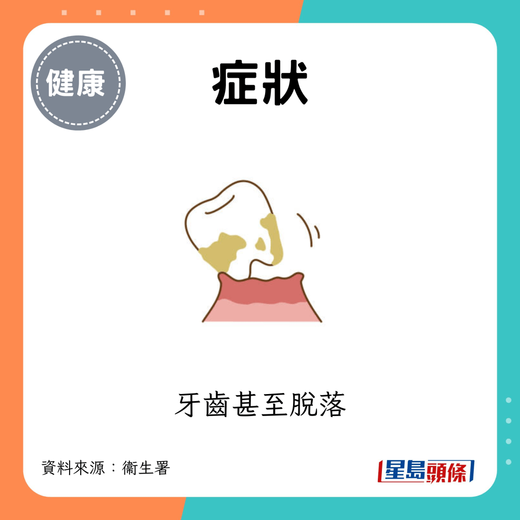 如果牙菌膜積聚,牙齦邊緣會出現發炎征狀,造成輕微牙周?。囱例l炎)。 若身體抵抗力下降,身體組織愈合能力欠佳,牙周組織包括牙齦、牙周膜和牙槽骨等就會遭受破壞,情況就會惡化,形成嚴重牙周?。囱乐苎祝?。