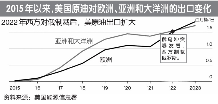 “在對俄羅斯實施制裁后,美國原油出口有了更加顯著的擴大?!睋聿┥鐖蟮?,數據顯示,從2021年到2023年,美國對法國的出口增長了近40%,而對西班牙的出口增長了134%。彭博社匯編的船舶跟蹤數據顯示,美國對歐洲的原油出貨量在今年3月份達到創紀錄的220萬桶/日。