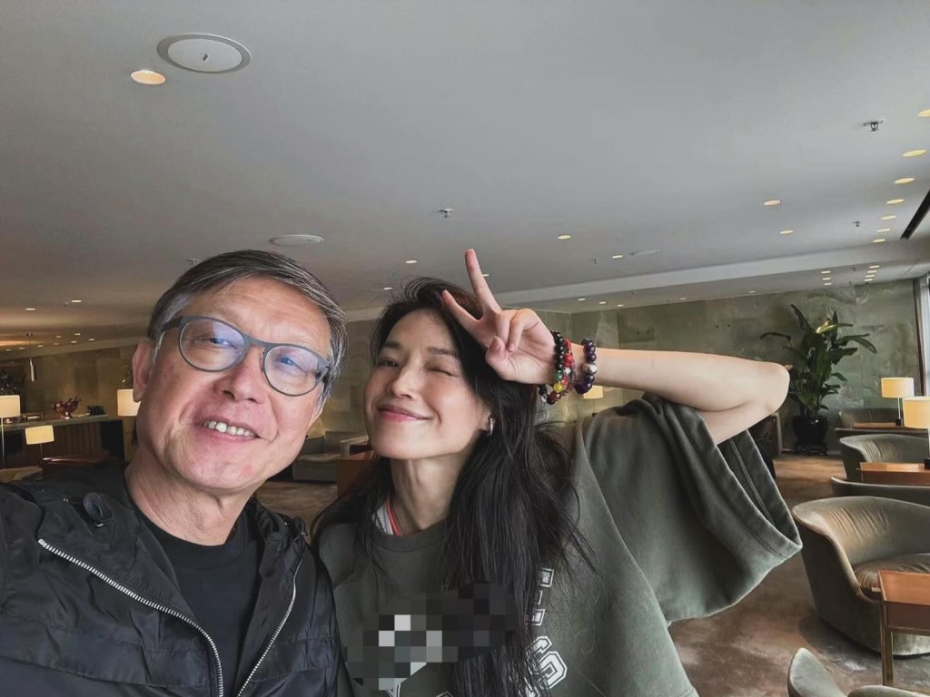 5日舒淇在IG貼了一張與劉偉強導演在機場的合照,淡妝的舒淇做出單眼舉V的勝利手勢,調皮樣子令她眼紋及樹根頸紋乍現。