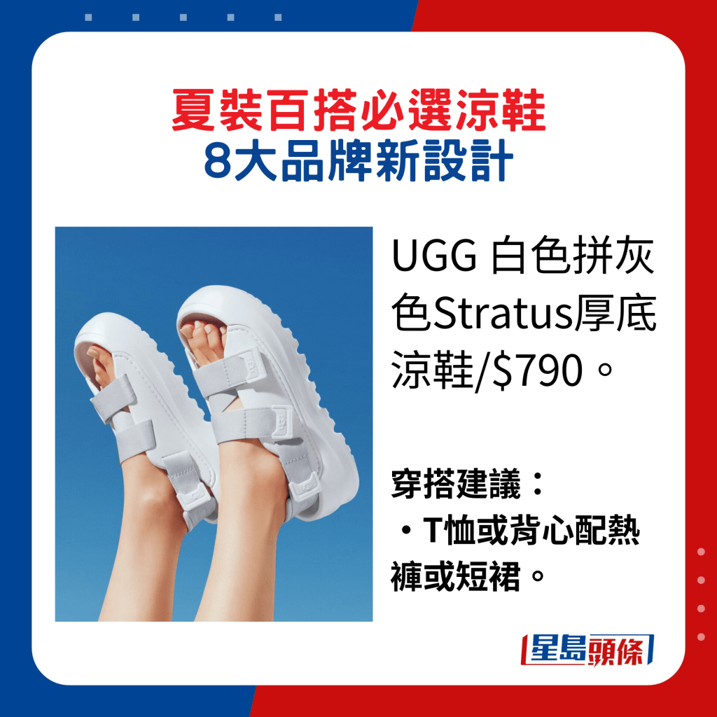 輕松又易穿易襯的T恤、背心、短裙、熱褲及松身長褲等夏裝單品,配以一雙休閑厚底涼鞋最理想。今季不少新設計都主打環保,好似圖中為人氣韓國女團NewJeans成員Hanni所穿的UGG粉紅色GoldenGlow,正是采用可持續材料甘蔗EVA制作,并以凸紋厚底設計,環保又舒適。她配襯白色拼粉紅色掛頸短身上衣及粉紅色松身長褲,塑造活潑型格。另一款Stratus版本則在鞋身及搭帶大玩對比色設計,同樣搶眼。