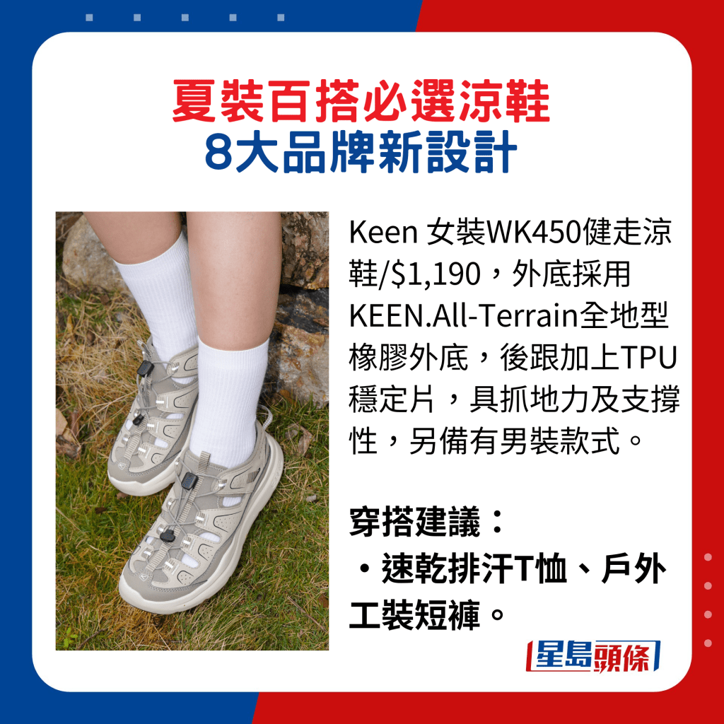 ▲Keen 女裝WK450健走涼鞋/$1,190,外底采用KEEN.All-Terrain全地型橡膠外底,后跟加上TPU穩定片,具抓地力及支撐性,另備有男裝款式。穿搭建議:速干排汗T恤、戶外工裝短褲。