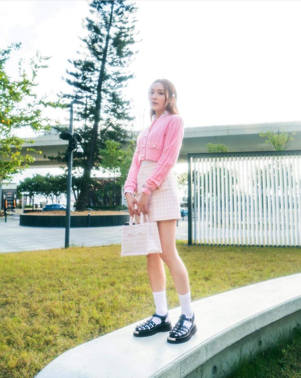 ▲李佳芯以白色短襪及格紋短褲,配襯Sandro窩釘黑色羅馬鞋款涼鞋,造型清新。(圖片來源:IG@aliaime)
