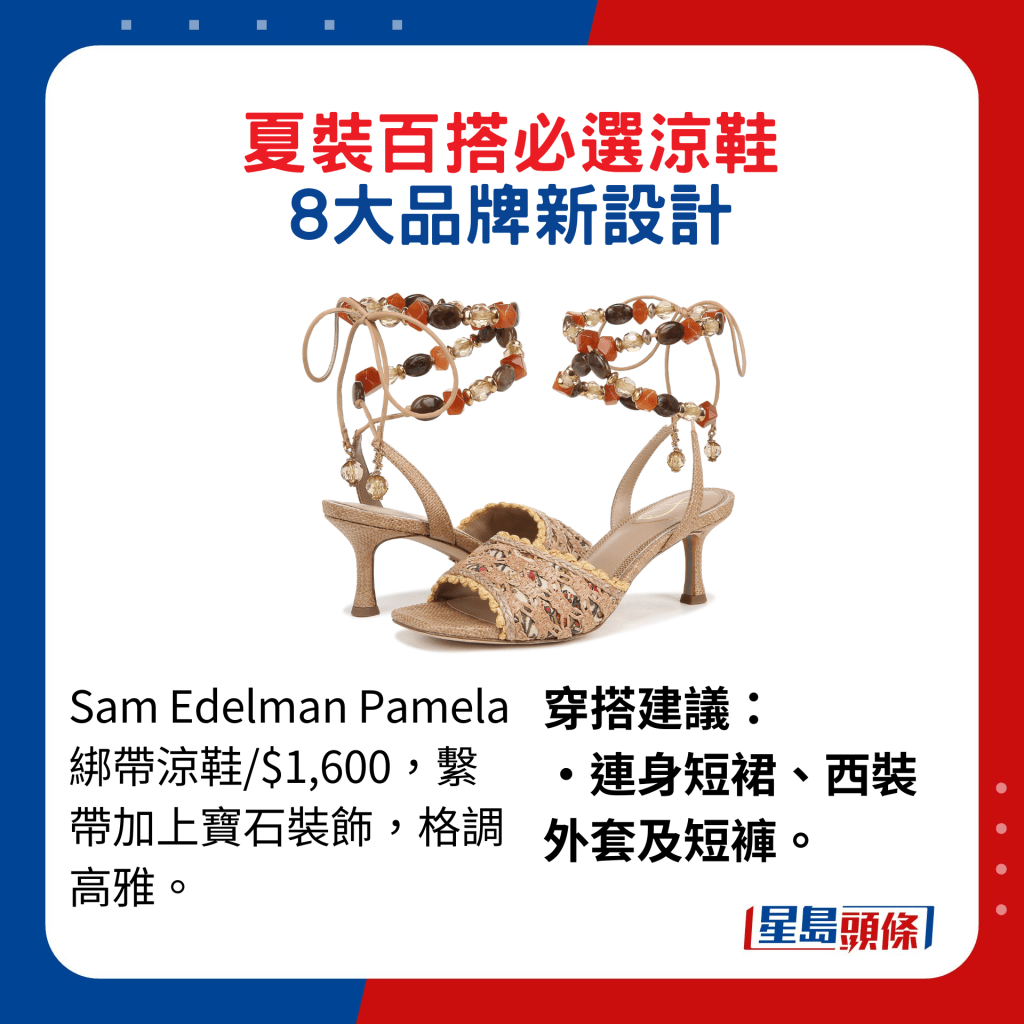 ▲Sam Edelman Pamela綁帶涼鞋/$1,600,系帶加上寶石裝飾,格調高雅。穿搭建議:連身短裙、西裝外套及短褲。