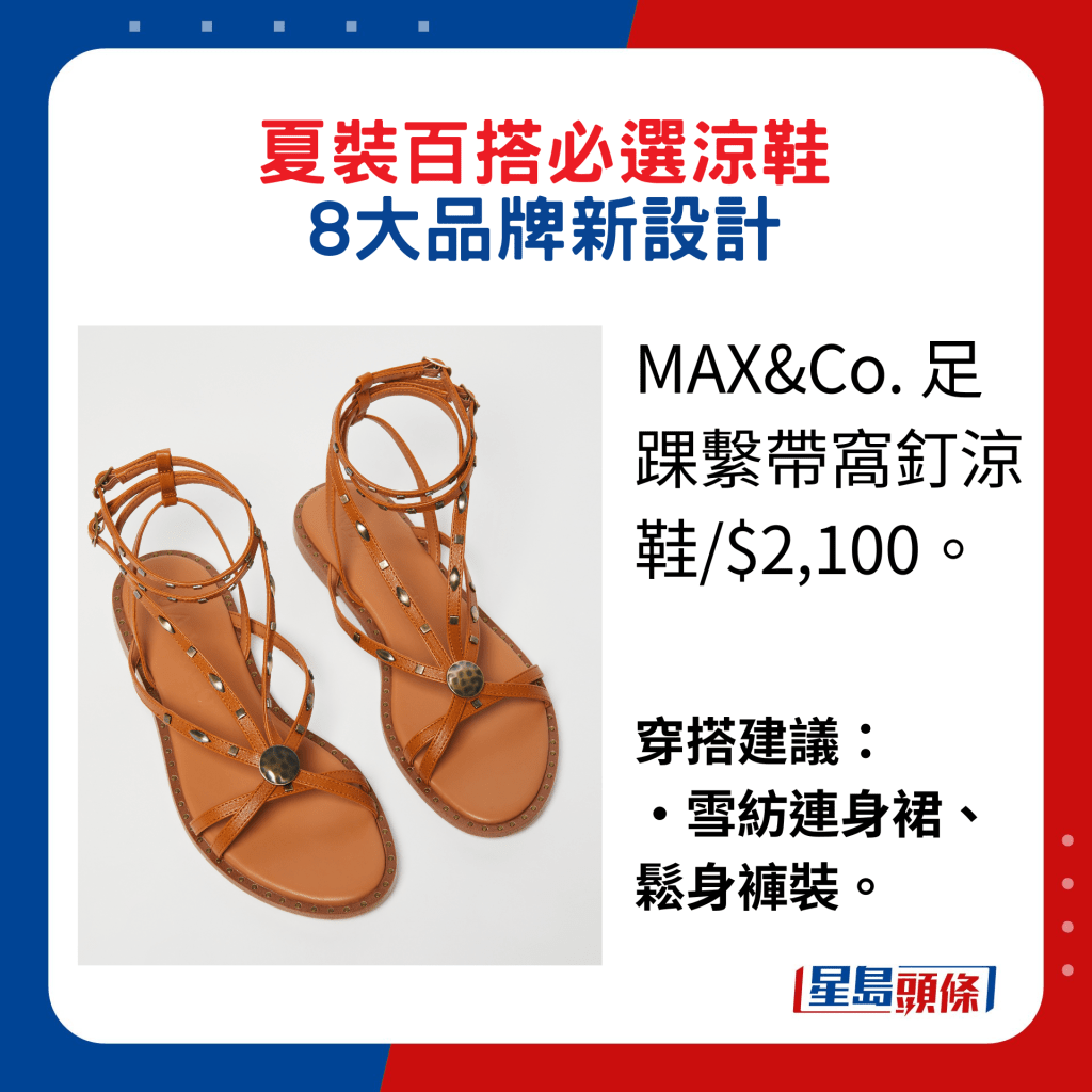 ▲MAX&Co. 足踝系帶窩釘涼鞋/$2,100。穿搭建議: 雪紡連身裙、松身褲裝。