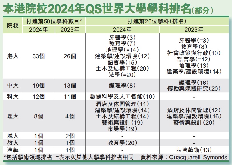 ▲香港院校2024年QS世界大學學科排名(部分)