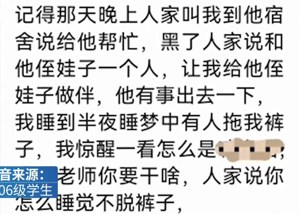 網傳聊天記錄顯示,有人稱曾在晚上被馬某某叫到宿舍幫忙并被留宿,半夜發現馬某某脫其褲子,另有人稱馬某某把自己叫到宿舍撫摸背部。