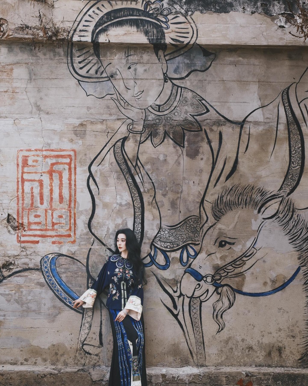 范冰冰穿上藍色的服裝,在古跡及攤檔留影。