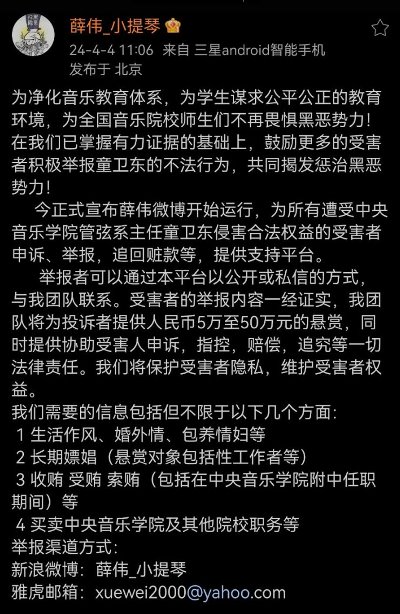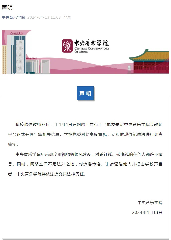 中央音樂學院官微今天發布消息:我校退休教師薛偉,于4月4日在網絡上發佈了“揭發懸賞中央音樂學院某教師平臺正式開通”等相關信息。學校黨委對此高度重視,立即依規依紀依法進行調查核實。