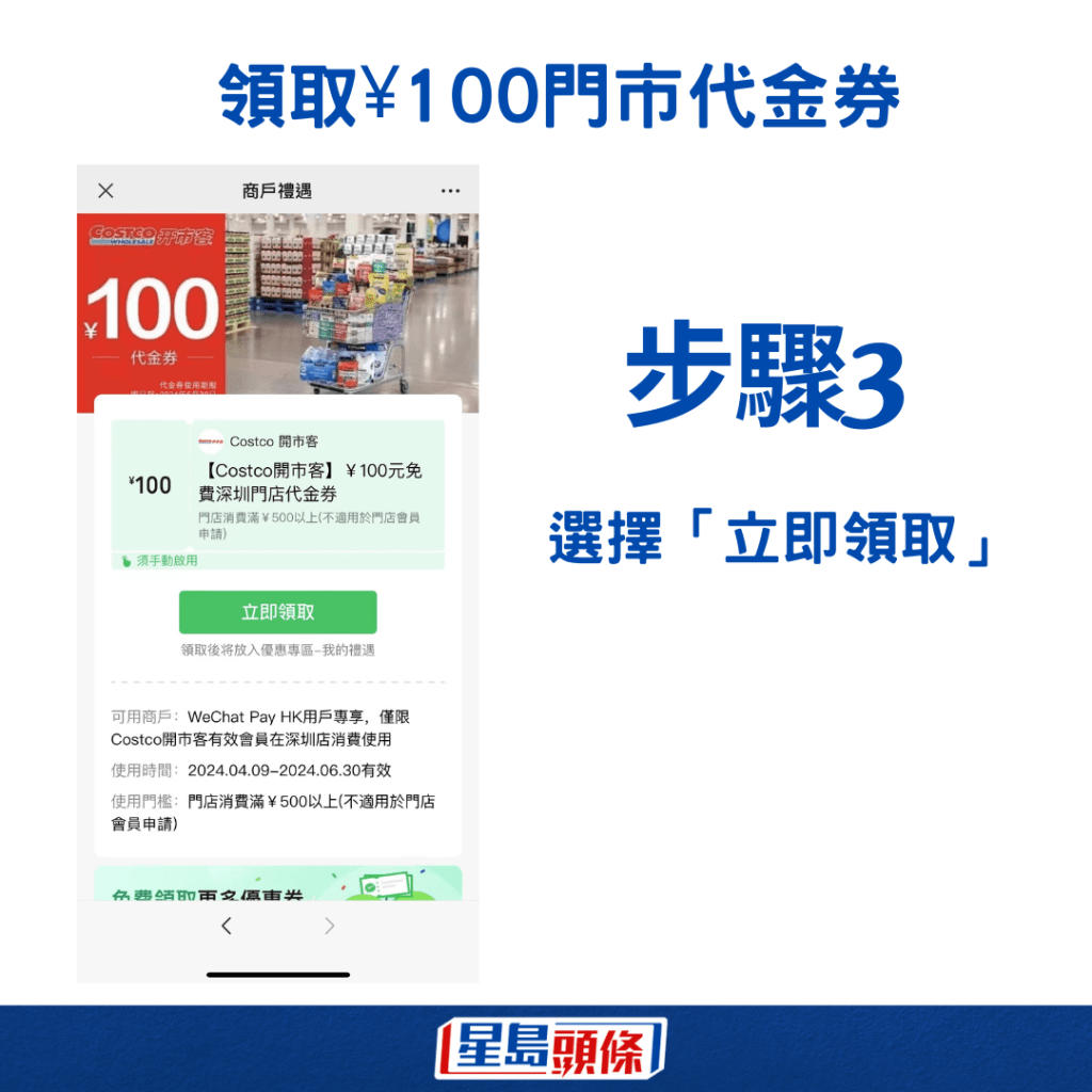 即日起至6月30日,WeChat Pay HK用戶只要透過WeChat Pay HK跨境游頁面,點擊活動橫幅進入頁面,即可領取價值¥100的Costco門市代金券,店內消費滿¥500可使用。 不過要留意,此券不可用于申請會員費用,而且需要用WeChat Pay HK港幣錢包領取。