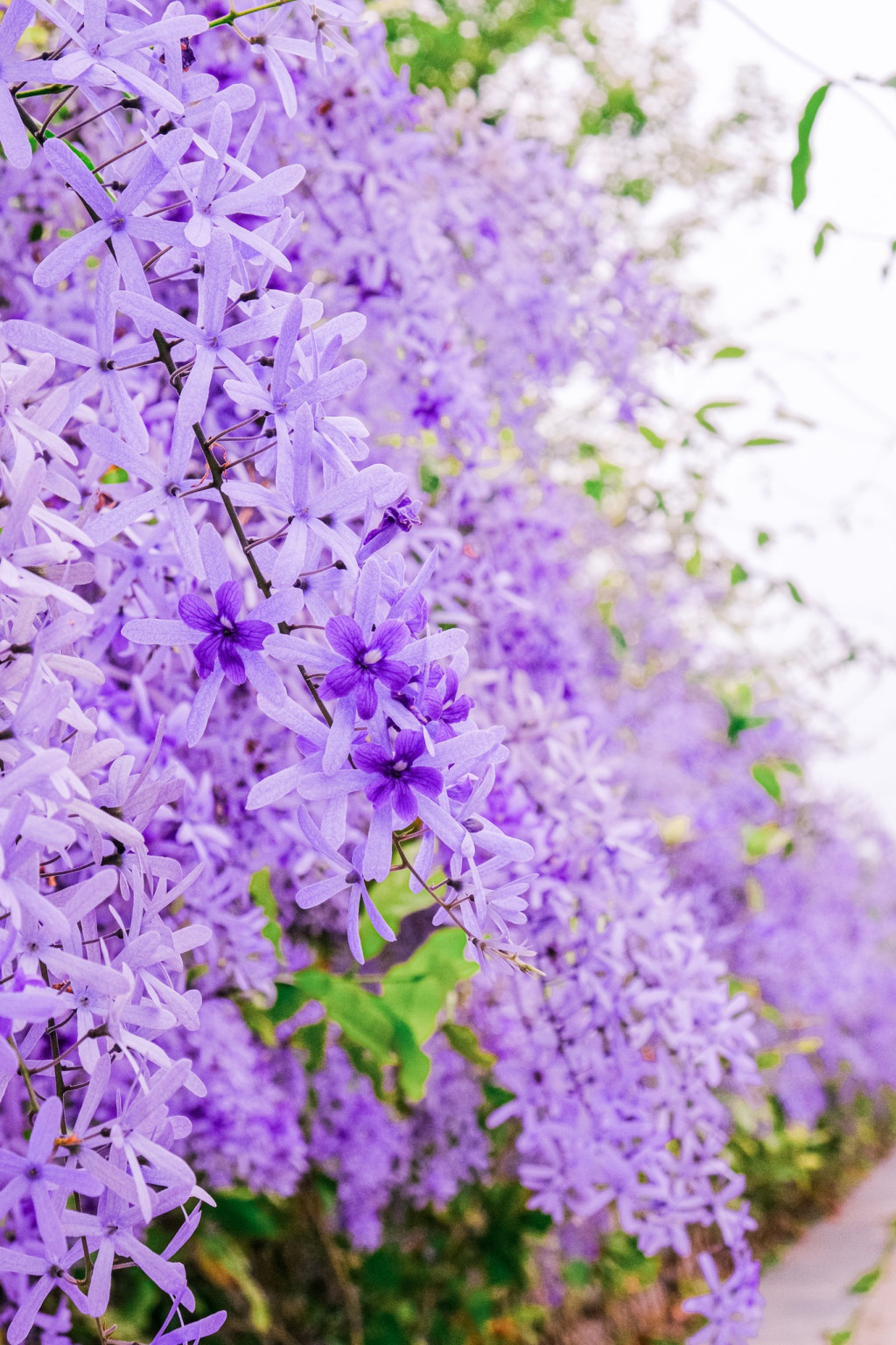 大埔慈山寺內的錫葉藤已經盛開,在慈山寺普門外通往觀音圣像小路兩旁,可以見到有一串串錫葉藤從樹上垂下,形成一大片紫色花海,在白色觀音像及寺廟的深色外墻前顯得份外突出。