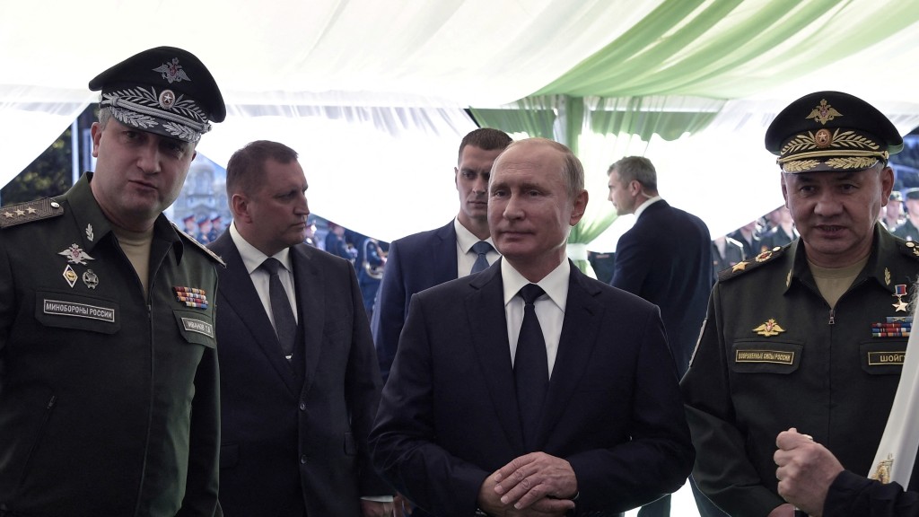 ▲2018年,國防部副部長伊萬諾夫(Timur Ivanov,左)向普京(中)和紹伊古(右)一同出席活動。 路透社