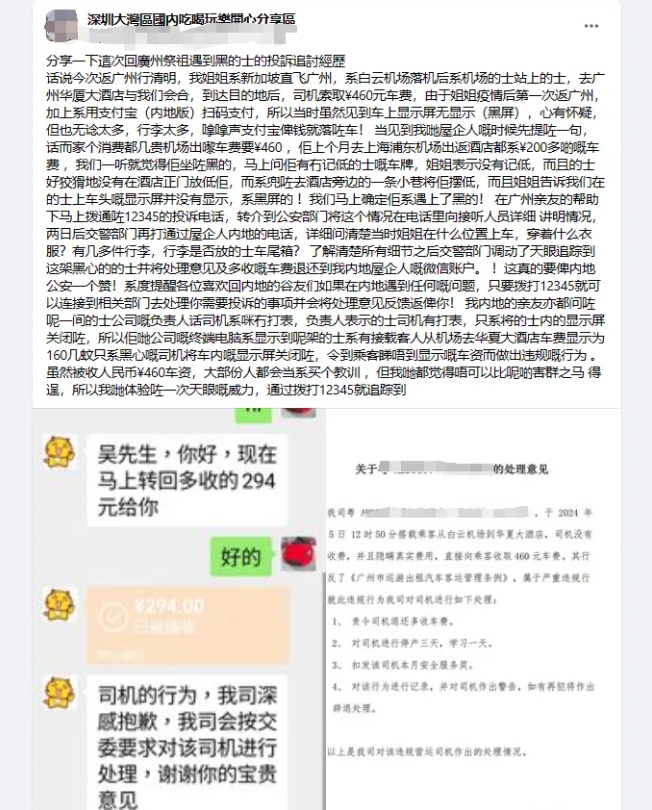 在廣州的親友得知這一情況后,建議姐姐可以撥打12345投訴,后來通過電話轉介到了內地的公安部門,并向警察詳細講明了當時的情況。2日后再收到內地交警部門的回復,詳細詢問了上下車地點、當日穿著以及行李等細節。了解情況后,交警部門通過天眼追蹤到這架黑心的士,并將處理意見及多收的費用退還。