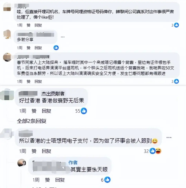 亦有不少網民忍不住跟香港作出比較,表示“內地先進過香港”、 “內地真是比香港進步”、“內地好多方面都做得好過香港,有問題可以追討”,亦有網民提議“香港亦應立法的士用電子支付,遇到有的士違法,也可容易追查”。
