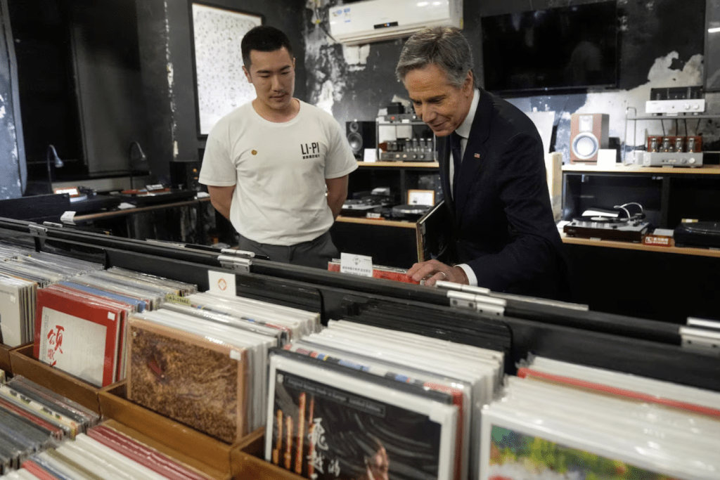 眾所周知,62 歲的布林肯是音樂發熱友,形容音樂是“跨越地理距離的最佳連結”,且擅長彈結他。曾公開表示喜歡黑膠唱片的他,昨日乘車前往北京機場準備搭機離境途中,突然去了一家名“LiPi”的文青黑膠唱片行。