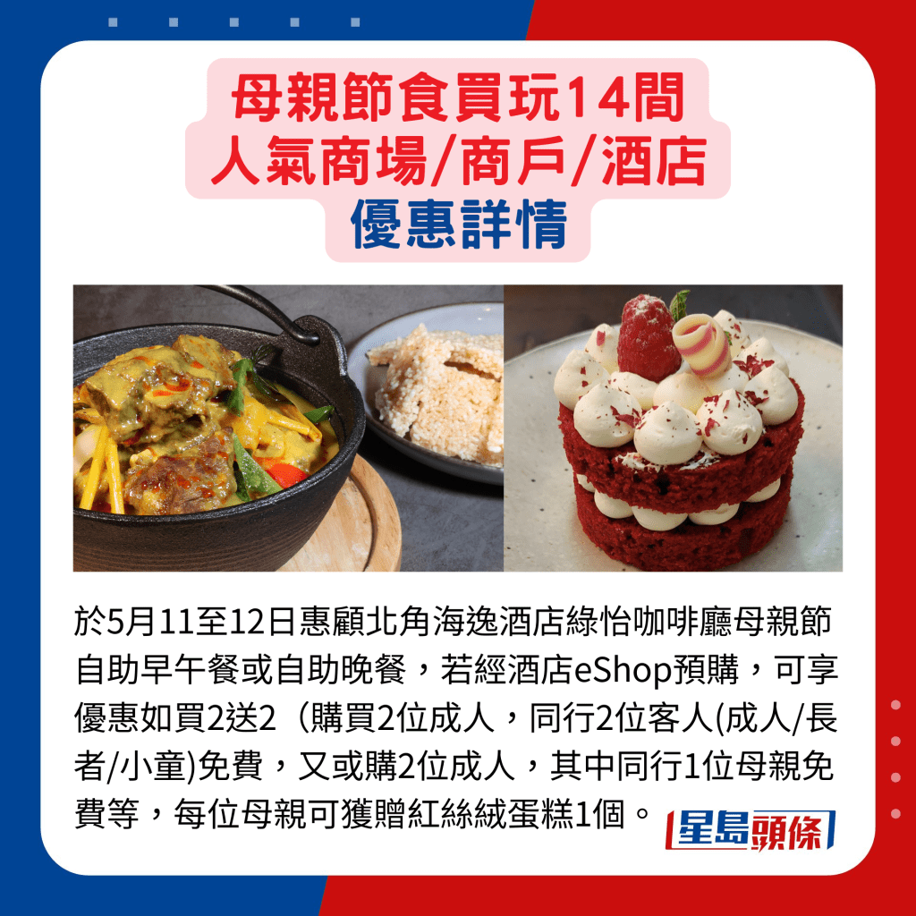慶祝母親節,嘆美食是必備環節。北角海逸酒店綠怡咖啡廳母親節自助早午餐及晚餐,于5月12日惠顧,每位媽媽可免費獲贈紅絲絨蛋糕。若經酒店eShop預購,可享優惠如買2送2(購買2位成人,同行2位客人(成人/長者/小童)免費,又或購2位成人,其中同行1位母親免費等。至于銅鑼灣問月酒店的Supergiant推出“母親節早午燒烤饗宴”優惠,于5月2日或之前在美麗華集團網店Mira eShop選購,可享買2送1優惠。