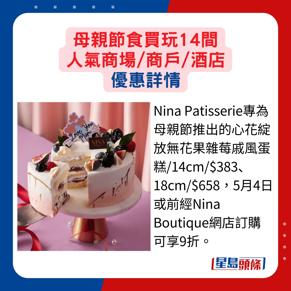 假如想買母親節蛋糕,時尚甜點品牌Nina Patisserie正有新推出的心花綻放無花果雜莓戚風蛋糕,只要在5月4日或之前經Nina Boutique網店訂購可享9折,另美心西餅亦新推For Her母親節蛋糕系列,于5月9日前選購指定款式則享85折。