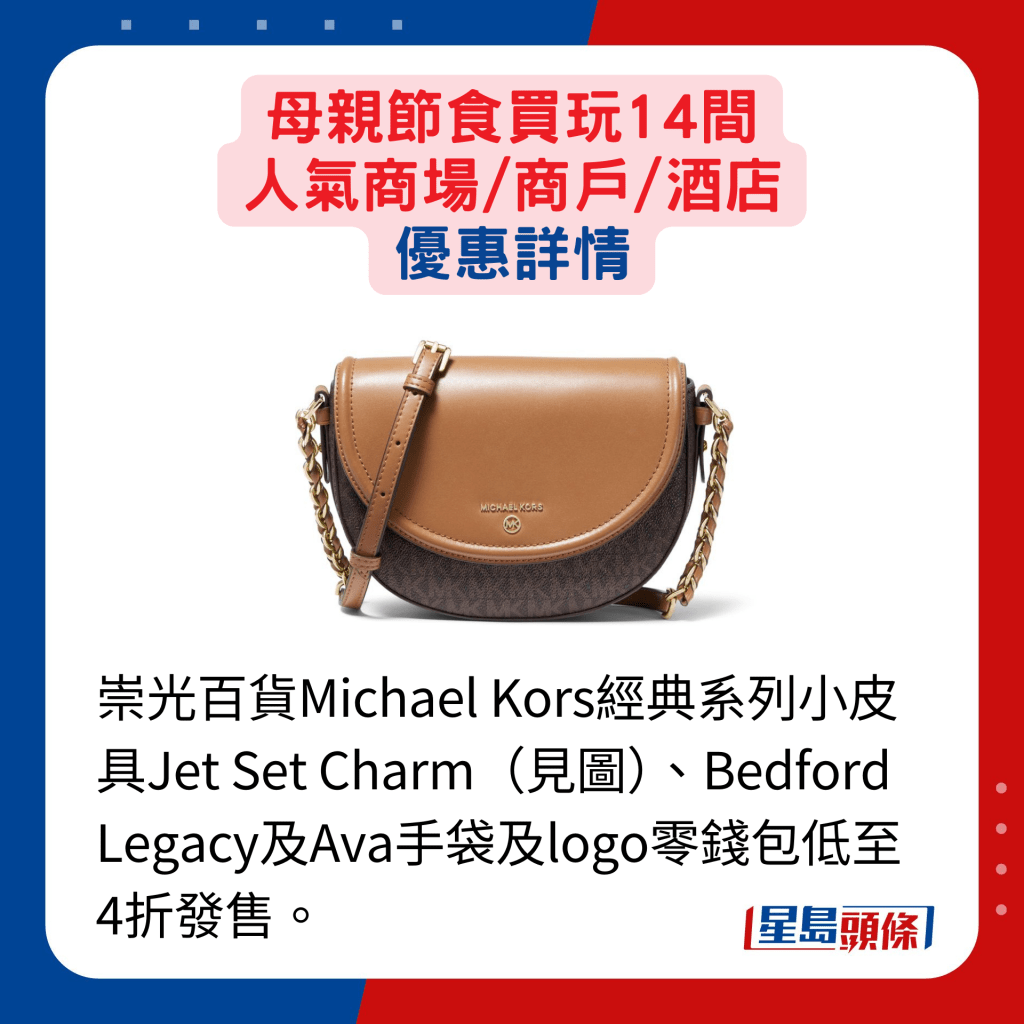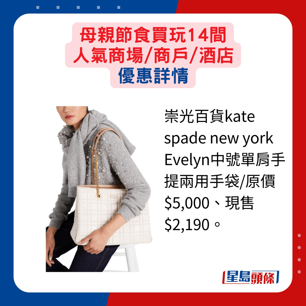 人氣百貨及商場商戶都有推出迎合母親節的推廣活動,產品網羅時裝配飾、護膚及美妝品等。崇光百貨由即日至5月26日舉行感謝祭,逾百國際品牌的指定產品提供不同折扣優惠,SOGO Rewards會員買滿指定金額,更可獲現金券或以優惠價換購指定產品等。想選購美妝護膚品的話,朗豪坊由即日至5月12日舉行Langham Beauty Fest S/S 2024,逾60個國際美容品牌如Shiseido、SK-II、YSL BEAUTé、Armani Beauty及IPSA等,推出超過300款低至3折的獨家禮遇、配搭優惠及限量激賞,例如Shiseido指定眼膜買一送一,另價值$2,050的IPSA亮白凈斑精華套裝,就減至$820發售。