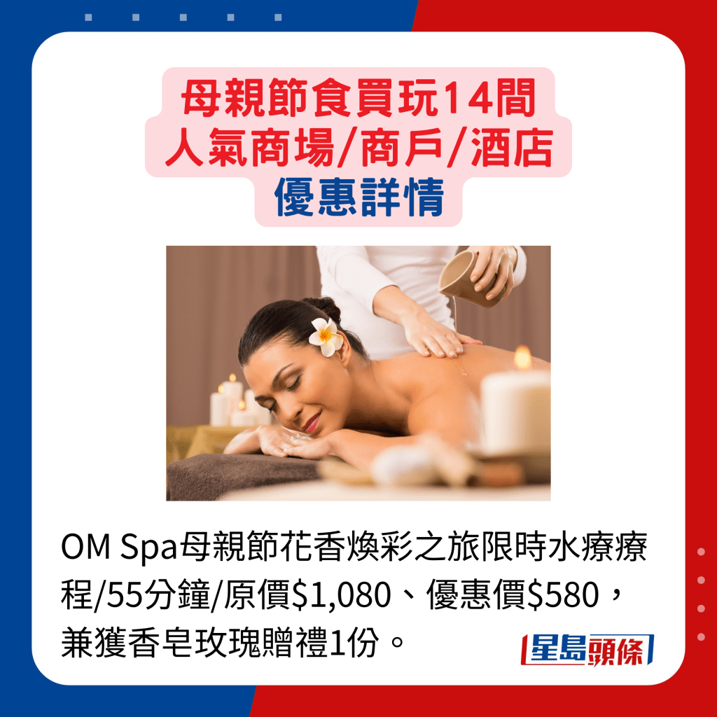 送給媽媽酒店級的按摩及水療,讓她放松身心,最好不過。機場富豪酒店及沙田麗豪酒店的OM Spa,趁節日推出花香煥彩之旅限時水療療程,原價$1,080,現售$580,接近半價已可享受招牌香薰按摩療程,又或極致保濕面部護理,更可獲贈香皂玫瑰。