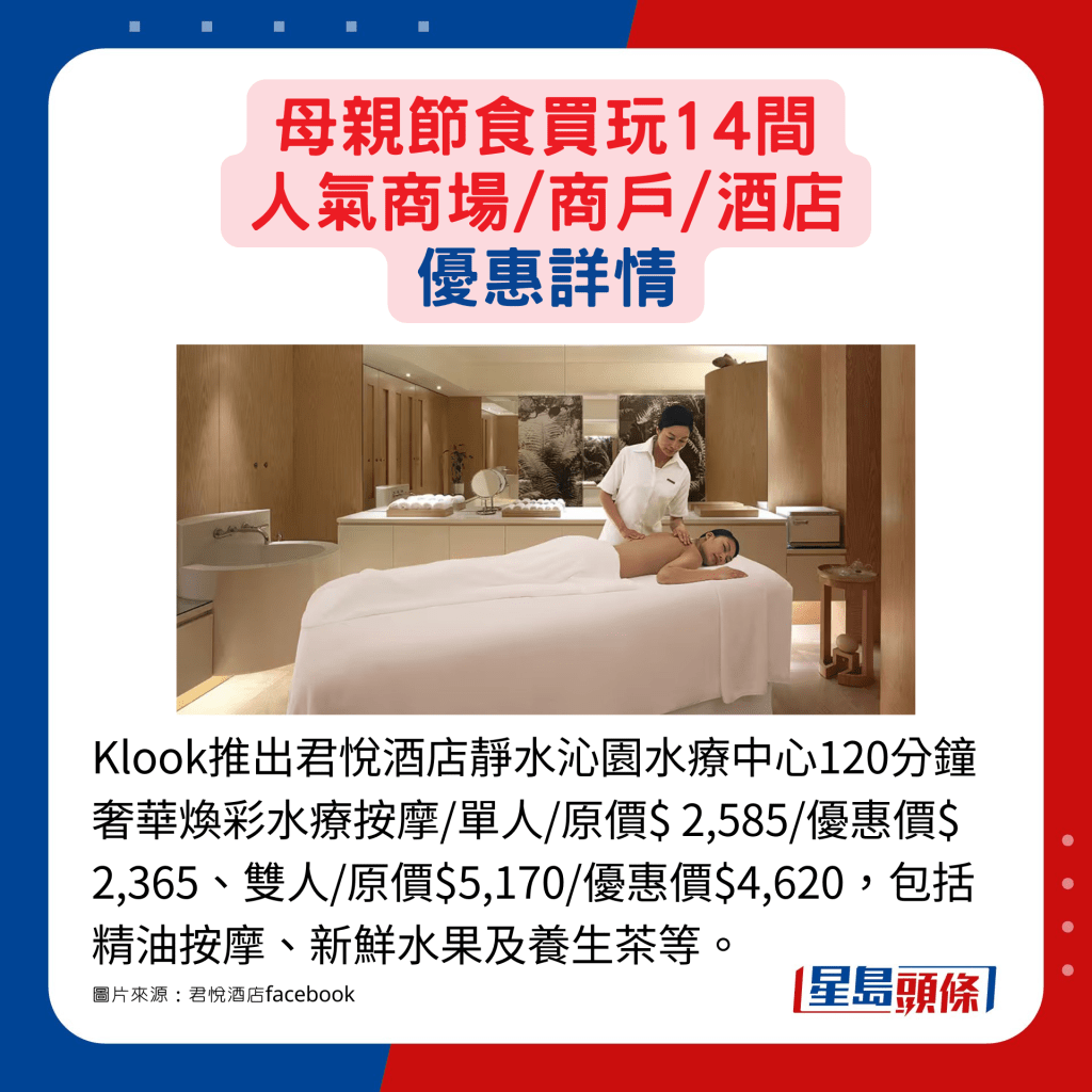 旅游玩樂平臺網站Klook亦有推出酒店按摩及水療推廣,例如可以優惠價$1,580享受富麗敦水療中心的75分鐘按摩及面部護理,更可同時獲贈水療禮券、享用泳池及溫熱水療設施等,媽媽大可盡情享受Me Time。