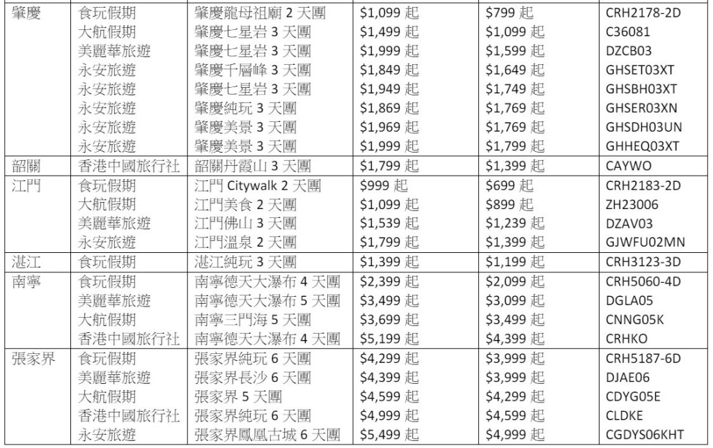 指定旅行社:大航假期、香港中國旅行社、食玩假期、美麗華旅游、永安旅游
