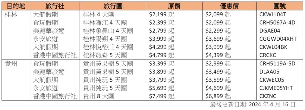 高鐵日前推出50款高鐵旅行“超值團”優惠,當中包括張家界、貴州、桂林等國內14個目的地,驚喜優惠價更低至$88起,包括深圳1天團$88起、江門2天團$699起、桂林4天團$2099起等。無論喜歡沿鐵路欣賞景色、品嘗各地風味美食或快閃深圳大型超巿掃貨,都有旅行團適合你!
