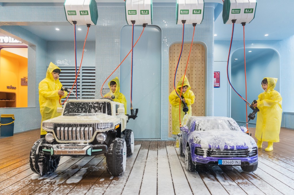 早前Hannah雨豬仔媽媽就帶小朋友去全新開幕的奈爾寶家庭中心NeoBio南山區匯港店游玩,小朋友先到“洗車場”扮洗車員,那里備有多架小車輛,還有各式各樣的專業洗車設備,如泡沫槍、水桶等,小小洗車員穿上雨衣、水鞋后,就要“開工”用泡沫槍噴的柔和泡沫,為車輛“洗白白”,之后就到“車廠”維修車輛,“車廠”更如真實維修公司一樣,將車輛架起讓小小維修員躺在地上維修車底!小朋友還可到超級市場shopping,採購各式各樣食物,再到收銀處“付款”后,就可到迷你廚房發揮廚藝!生活在城市的孩子未必知道如何取牛奶,在“奶牛牧場”就可嘗試擠牛奶,還可跟“小動物”近距離接觸。